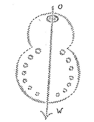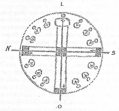 A construção inteira está orientada de leste para oeste. (Traça a linha leste-oeste). Os senhores devem ter visto que essa linha leste-oeste é o único eixo de simetria e que, portanto, tudo é orientado simetricamente por esse eixo.