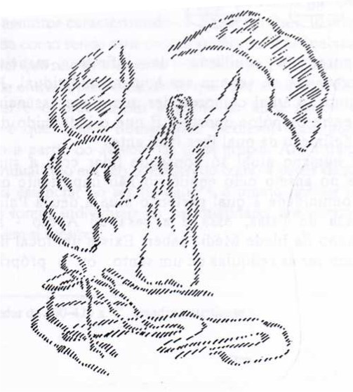 É nisso que o ser humano, nos tempos modernos, deve sentir a antiga sentença de Apolo “Reconhece-te a ti mesmo”. Mas “Reconhece-te a ti mesmo” não em qualquer abstração: “Reconhece-te a ti mesmo no anseio pelo equilíbrio”. Por isso devemos erguer a leste do edifício aquilo que fará com que o ser humano possa sentir esse anseio pelo equilíbrio. E isso deverá ser representado na escultura de madeira mencionada ontem, que tem como figura central a imagem de Cristo, a imagem de Cristo que procuramos esculpir de modo a podermos imaginar: Foi assim que o Cristrealmente caminhou na Terra, na Palestina, no corpo do homem Jesus de Nazaré, no início da nossa cronologia cristã. Os quadros convencionais do Cristo barbudo são apenas criações do quinto e sexto séculos, e eles realmente não são nada fiéis ao retratado, se assim posso expressar-me. Foi isso que procurei: criar um Cristo fiel ao retrato que fosse, ao mesmo tempo, o representante do ser humano que procura e anseia pelo equilíbrio. (Desenha).