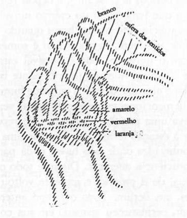 Mas o que lhes descrevi agora pertence a uma grande parte do ser humano mas não, verdadeiramente, ao ser humano inteiro. Para caracterizar-lhes esse fato, terei que fazer uma indicação esquemática. Suponhamos: Essa seria a região dos sentidos (branco), onde aglomero