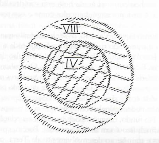 Falamos despreocupadamente que, como homens físicos, estamos dentro do círculo de ar. Temos que reconhecer, também, que esse círculo de ar faz parte de nós mesmos. Não é verdade? Pois aquele ar que está agora dentro de nós, há pouco ainda estava fora de nós. Como seres humanos não podemos imaginar-nos fora desse círculo de ar. Mas como humanidade moderna acostumamo-nos a acreditar que antes também era assim – o que não é absolutamente o caso – , e a falar do ar e de coisas semelhantes somente na forma moderna. Hoje achamos estranho dizer que nós, do mesmo modo como vagamos pelo ar, estaríamos vagando por uma esfera que, por assim dizer, contém as condições para que sejamos seres sensoriais, seres inteligentes, em resumo que contém as condições para que tenhamos em nós tudo o que pode ser expresso simbolicamente no sentido que acabamos de mencionar, por sermos seres capitais. Porém eu lhes disse que essa é tão somente uma das esferas em que estamos. Entretanto encontramo-nos em diversas esferas, e queremos agora adiantar-nos para uma esfera da vida prática da humanidade, e prestar atenção a tudo em que vivemos pelo fato de que à nossa Terra precederam três estágios de desenvolvimento, e que estamos no quarto. Deixaremos tudo isso caracterizado por essa área do círculo no qual vivemos, de certa forma, como em nossa quarta esfera de desenvolvimento (desenha a área interna do círculo em vermelho). Além dessa, vivemos numa outra esfera de desenvolvimento pelo fato de fazerem parte dela as entidades espirituais que são nossos criadores, da mesma forma como essa quarta esfera de desenvolvimento faz parte de nós. Agora deixemos de olhar para nós, seres humanos, olhemos para aqueles seres que, na seqüência das hierarquias superiores a nós, sempre denominamos os espíritos da forma, os espíritos de todo o elemento formal criativo. Teremos que dizer que, como seres humanos, alcançaremos a esfera que atribuímos a esses nossos espíritos criadores divinos somente quando a Terra tiver atravessado mais três estágios de desenvolvimento descritos na minha “Ciência Oculta” e designados estágio de Júpiter, estágio de Vênus, estágio de Vulcano, e quando a Terra tiver chegado ao oitavo estágio. Quer dizer, esses espíritos criativos estão onde nós, homens, estaremos depois do desenvolvimento de Vulcano. Ali encontra-se a esfera que faz parte deles, assim como a quarta esfera pertence a nós. Mas temos que imaginar essas duas esferas encaixadas, permeando-se mutuamente. (Desenha sobre a primeira área do círculo outra maior, laranja.) Se eu denominar a outra esfera, que acabei de mencionar, como sendo a oitava, não vivemos somente na quarta, mas também nessa oitava esfera porque nessa esfera vivem conosco nossos criadores divinos.